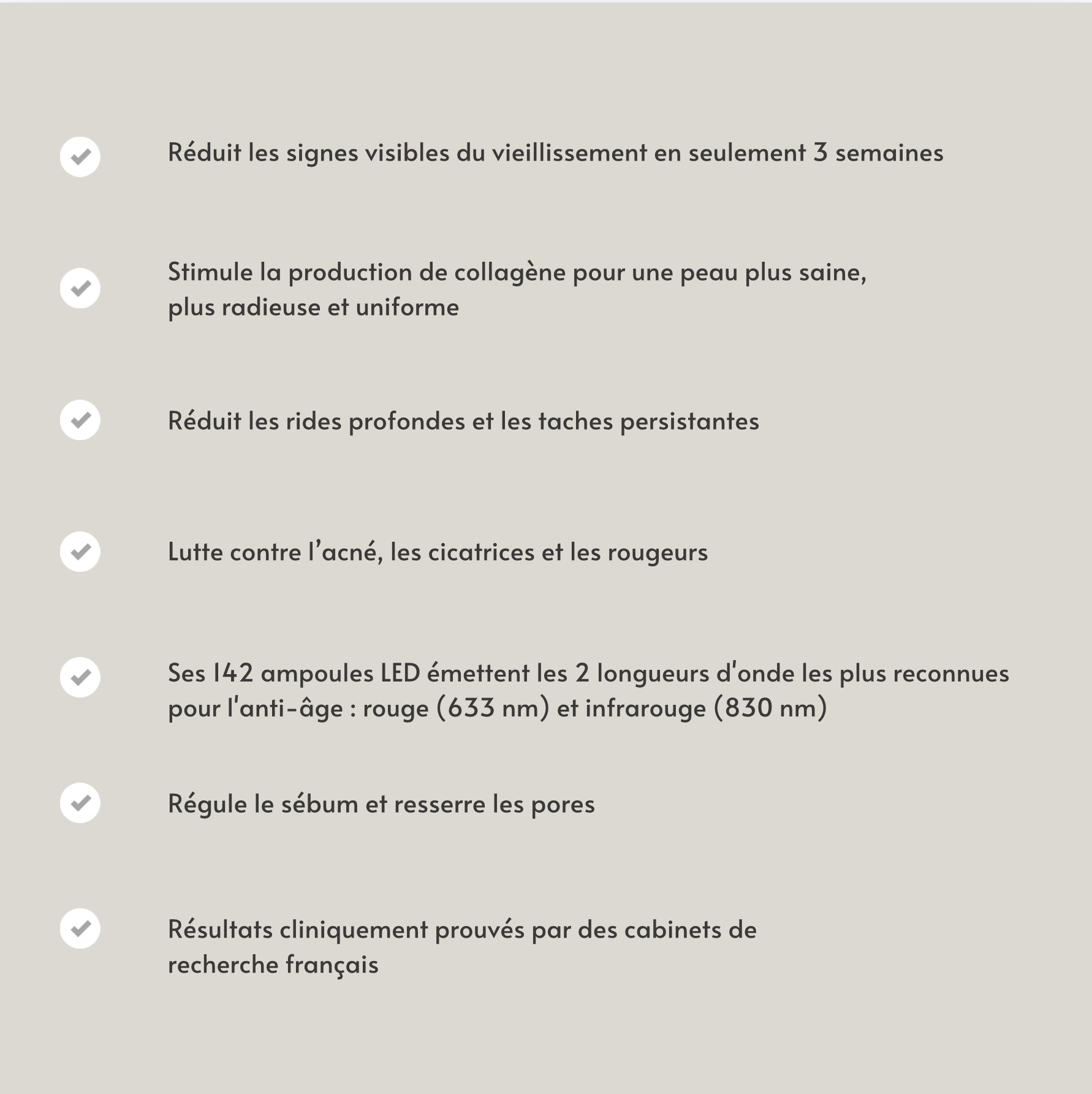 Il est possible de constater des résultats en seulement 2 semaines en l’utilisant 10 minutes par jour. La technologie brevetée des LED infrarouges 830 nm permet une pénétration en profondeur, stimulant la régénération cellulaire et améliorant visiblement la qualité de votre peau.